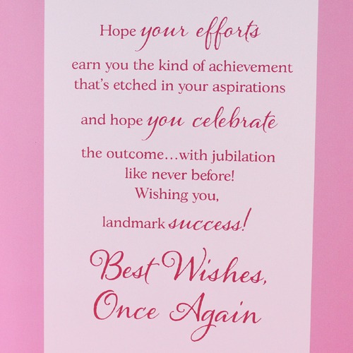 • Inside Card: Hope your efforts earn you the kind of achievement that`s etched in your aspirations and hope you celebrate the outcome... with jubilation like never before Wishing you, landmark Success! Best Wishes Once Again